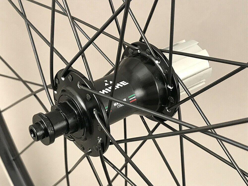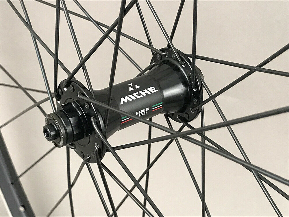 Quality Velocity A23 rims laced to Miche Primato Italian made hubs with sealed cartridge bearings via DT Swiss spokes.
